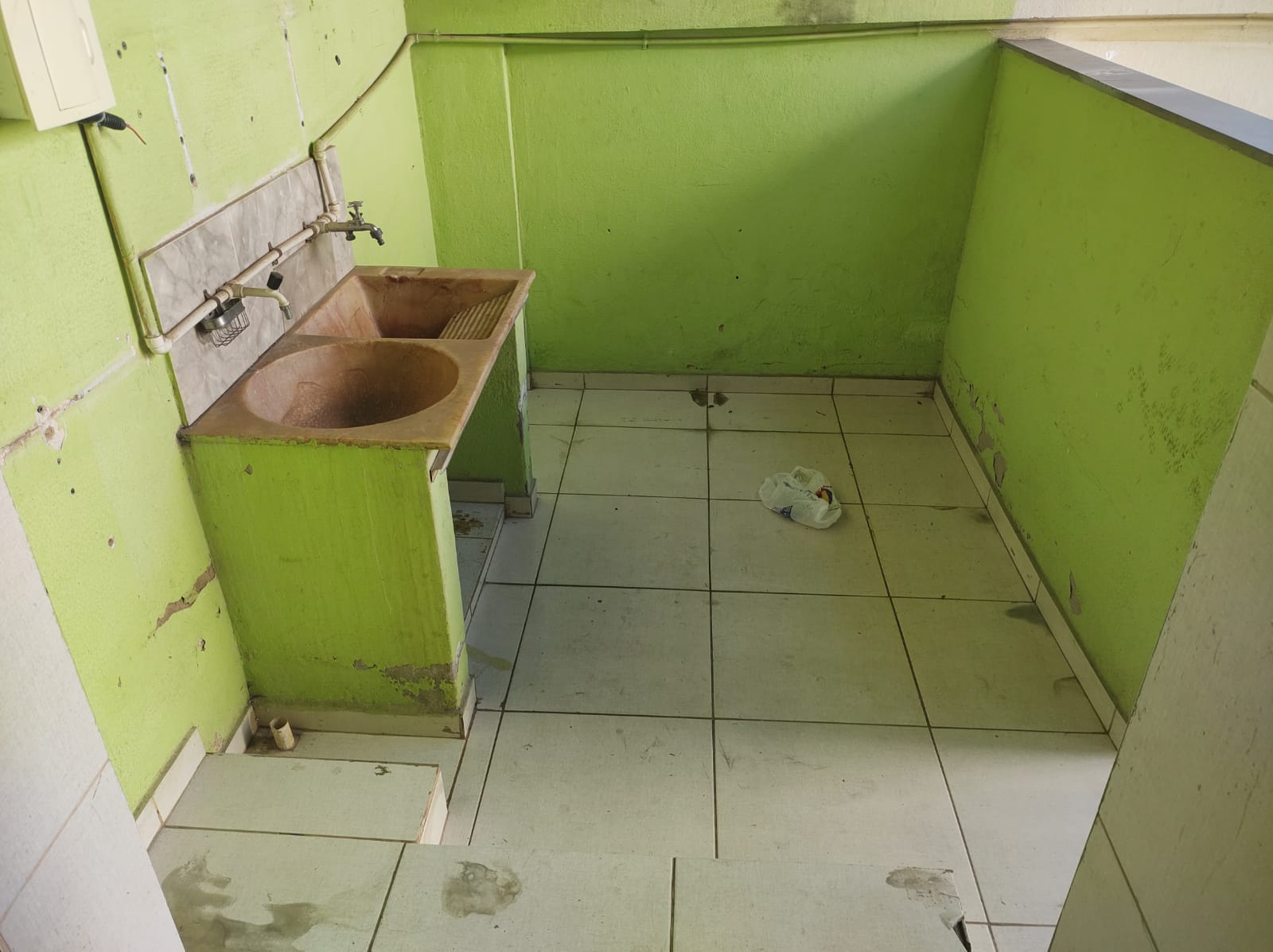 Casa de fundos plana, 2 quartos, cozinha em cerâmica, banheiro, varanda com área de serviço. A vaga de estacionamento é apenas para moto, e não é coberta.